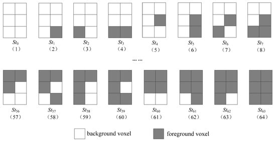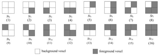 In order to reduce the accession of voxels considered above, we construct sixteen different states for a quad, which are denoted as St0, St1, …, St15, as shown in Figure 5. In this way, the left quad (four voxels) in the voxel pattern being processed can be replaced by the corresponding state, and thus, by utilizing transitions among the states, we only need to access the four voxels in the right quad in the current voxel pattern. Then, we describe the strategy in detail.