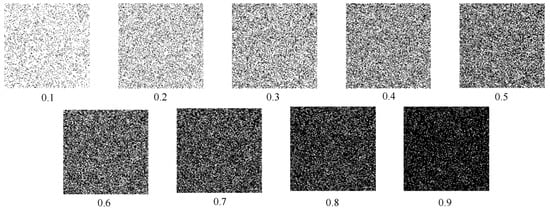 Because noise images have random voxel distribution and complex connectivity among voxels, they are conducive to evaluating the performance of the algorithms. In our experiments, five resolutions (32 × 32 × 32, 64 × 64 × 64, 128 × 128 × 128, 256 × 256 × 256, 512 × 512 × 512 voxels) of 3D noise images were tested. For each resolution, 41 noise images were generated by thresholding of the images containing uniform random noise with 41 different values from 0 to 1000 in steps of 25. We presented nine cross sections of 3D noise images with densities of 0.1 to 0.9 in steps of 0.1 in Figure 7. In order to make the experimental results more accurate, we repeated the test 1000 times and obtained the experimental results by averaging of the execution time of the compared algorithms.