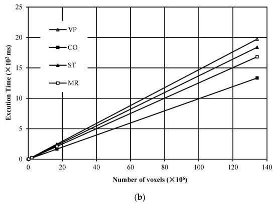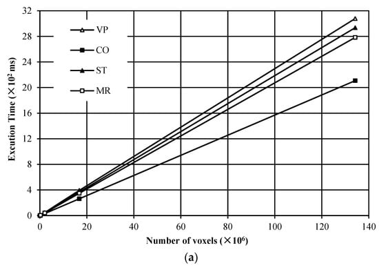 In this experiment, 41 noise images with a resolution of 64 × 64 × 64 voxels were tested for comparing the number of accessed voxels among the compared algorithms. The experimental results are shown in Figure 9. From Figure 9, it can be found that when all voxels are background voxels in the image, the number of accessed voxels in the VP algorithm is the same as that in the CO algorithm. With the increased densities of the foreground voxels in the images, the number of voxels needing to be accessed in the CO algorithm gradually becomes fewer than that in the VP algorithm. When all voxels are foreground voxels in the image, the number of voxels needing to be accessed in the CO algorithm is less than 1/10 of that in the VP algorithm. Moreover, for all tested images, the VP algorithm needs to access the same number of voxels. Similarly, the ST algorithm needs to access the same number of voxels for processing any image, but the number of accessed voxels is about half of that in the VP algorithm. As to the MR algorithm, for processing any image, it also needs to access the same number of voxels, which are fewer than that in the ST algorithm. This is consistent with our analysis.