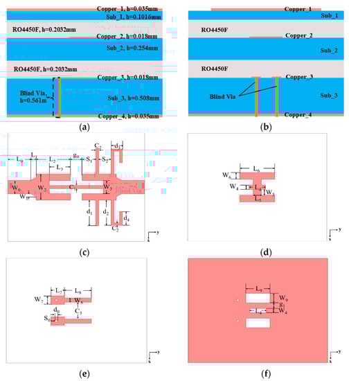 (a) Side view of filter structure; (b) Front view of filter structure; (c) Structure of top coupling patch, Copper_1; (d) Structure of second coupling patch, Copper_2; (e) SIR structure of the third layer, Copper_3; (f) Ground layer of DGS, Copper_4.