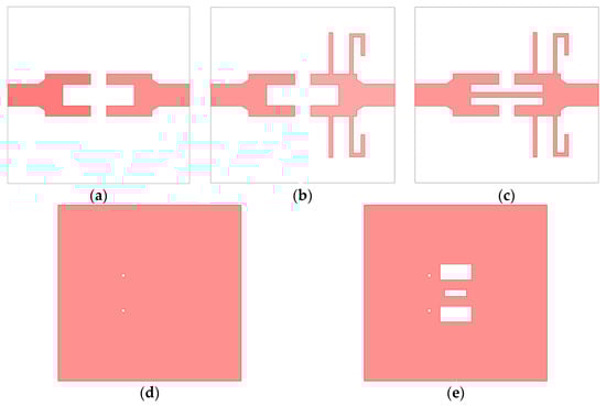 (a) Coupling pattern of two U-shaped microstrip lines; (b) Loading two groups of terminal-open stubs; (c) Adding central connecting microstrip line; (d) Ground plane with two blind holes; (e) Ground layer with defected structure.