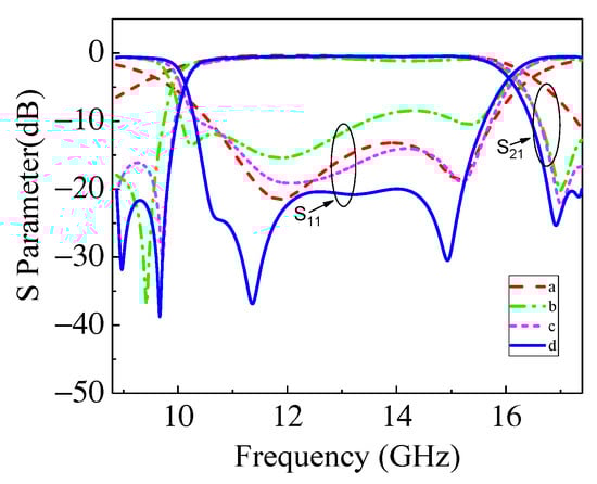 Comparison diagram of simulated reflection and transmission characteristic curves of structural evolution from Figure 2, in which curves (a) correspond to the structure of Figure 2a of two U-shaped microstrip lines; curves (b) correspond to the structure of Figure 2b of loading two groups of open stubs with different lengths on the top layer; curves (c) correspond to the structure of Figure 2c of adding central connecting microstrip; curves (d) correspond to the structure of Figure 2e of the ground layer with DGS.