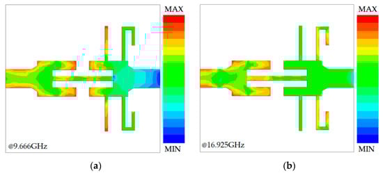 Because the terminal-open stubs are quarter wavelengths, two transmission zeros outside the passband will be generated, which correspond to 9.4 GHz and 16.8 GHz. At the same time, considering the coupling between two quarter-wavelength terminal-open stubs, the two groups of stubs are set at an appropriate distance to prevent the interference of short-range coupling on the transmission signal. The curves (b) in Figure 3 show that the roll-off factor is greatly improved after loading stubs, and the stopband harmonic suppression performance is also optimized. Introduction of two transmission zeros optimizes the passband selectivity, but in-band reflection coefficient becomes slightly worse. Of course, the stopband rejection characteristics are also not good. In the subsequent design process, the stopband suppression characteristics would be optimized by adjusting parameters on the premise of maintaining the passband characteristics. Figure 4 is the current distribution of the top coupling patch after parameter adjustment. The positions of the transmission zeros have a slight frequency shift compared with the initial one. It can be seen that, at the frequency corresponding to the transmission zeros, two groups of open-circuit stubs have played their roles.
