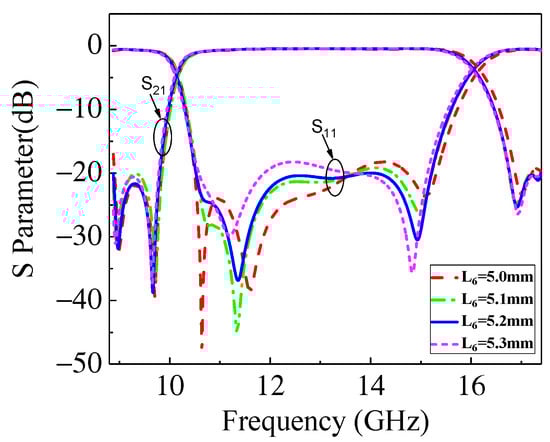 In Figure 5, the influence of length L6 of the wider side of the second coupling patch on RL is shown. With the increase of L6, the coupling area between the second coupling patch, the top coupling patch and the third-layer SIR branch lines gradually increases, thus improving reflection characteristics. When L6 = 5.2 mm, it can be seen that the curve of reflection coefficient between the two resonance points in the passband is less than −20 dB. It should be noted that the rectangular on the outside of the second coupling patch corresponds to the rectangular slots on the outside etched in the metal ground layer in the vertical position, the position of the resonance points in the passband will also be affected to some extent. L6 = 5.2 mm is finally determined as the optimal value.