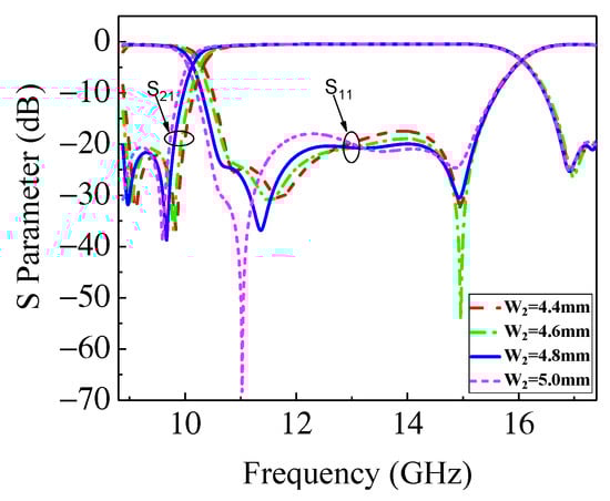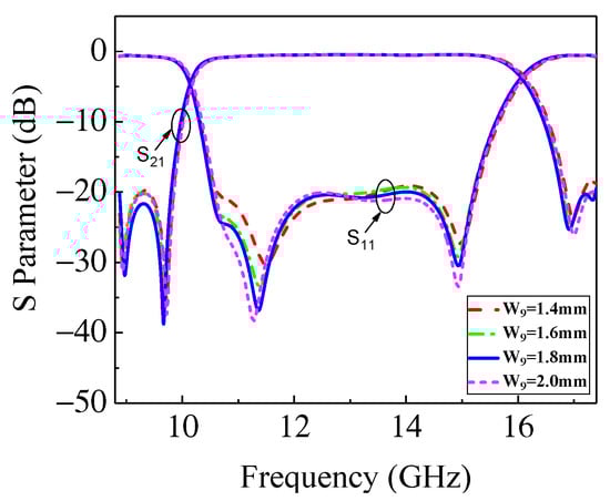 In Figure 8, effects of width W9 of wider and longer rectangular slots on the resonance points have been presented. Different from those DGS structures composed of multiple identical dumbbell-shaped patterns or some other combination of patterns, the method adopted here is simpler to design and adjust, since the design only consists of three rectangular slots. Two wider and longer rectangular slots of the same size are etched, and then a narrow and short rectangular slot is etched on their symmetry axis. Adjusting the size of three rectangular slots will change the current distribution on the grounded metal surface, which will lead to a change in the equivalent capacitance, and then cause the frequency shift of two resonance points. Of course, the distance between the slots will also have an impact on this. However, the DGS structure corresponds to the SIR on the second floor vertically, and the change in the distance will affect the return loss in the passband, so its parameter adjustment is limited to some extent. Finally, the size of the rectangular slot itself is selected for parameter analysis. In addition, the corresponding resonance frequency will gradually decrease due to the influence of the slow-wave characteristic [] caused by the blind holes. Therefore, we can find that with the width changing from 1.4 mm to 2 mm, the low-frequency resonance point moves from 11.385 GHz to 11.225 GHz, and the corresponding return loss decreases from −33.44 dB to −38.51 dB. Considering that RL is less than 20 dB, W9 = 1.8 mm is finally selected as the optimal value.