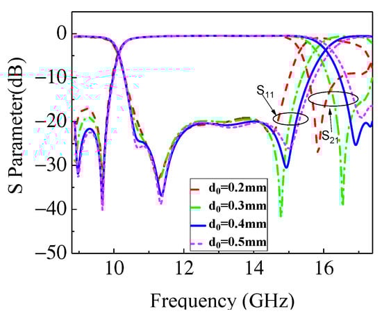 Figure 7 shows the influence of diameter d0 of blind holes on high-frequency cut-off frequency and stopband harmonic suppression. Considering limitations of actual processing conditions, the change in d0 should be controlled within an accuracy of 0.1 mm. Generally, the design of blind holes will change coupling strength by adjusting the depth of the blind holes [], and there are also designs that add vias or blind holes to change the current path, thus changing the resonance frequency []. The multilayer design in this paper needs to add RO4450 prepreg, so the change in depth is limited and the diameter of blind holes is changed for further analysis. As for the SIR on the third substrate, it can be regarded as a quarter-wavelength resonator, and the decrease in its length will lead to an increase in the corresponding high-frequency cut-off frequency. While d0 increases, which is equivalent to the decrease of the quarter-wavelength resonators, the corresponding high-frequency cut-off frequency will move to a higher frequency, and characteristics of high-frequency out-of-band harmonic suppression will also change. As d0 increases, the high-frequency cut-off frequency gradually moves to a higher frequency. Finally, d0 = 0.4 mm is determined as the optimal value under comprehensive consideration.