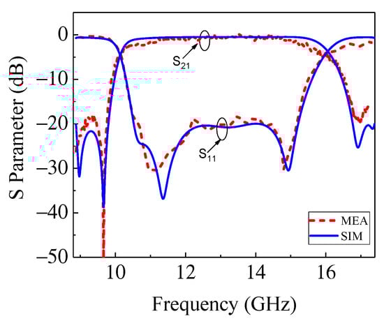 The photograph of the manufactured filter is shown in Figure 9a, and its characteristic curve is measured by the vector network analyzer (VNA) 3672D of Ceyear, Qingdao, China. The comparison between measurement and simulation results is shown in Figure 10. The measured 3 dB bandwidth ranges from 10.215–15.375 GHz, RL in the passband is better than 18 dB, roll-off rates are 85.80 dB/GHz and 10.74 dB/GHz respectively, and the insertion loss at the center frequency of 12.795 GHz is 0.58 dB. Measurement results are in good agreement with simulation, and errors in manufacturing and measurement result in some differences in curves.