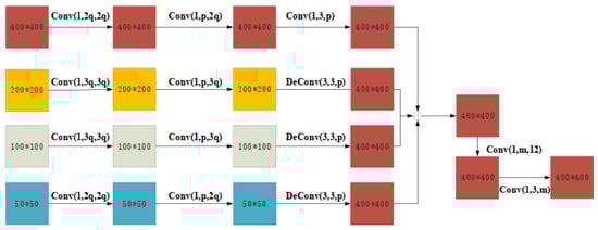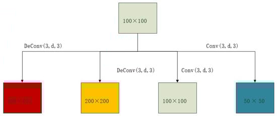 MFSRCNN uses Conv and Deconv to upsample and downsample the image, respectively, to obtain feature maps of four resolution sizes, which are used as the input of four parallel network branches. Parallel networks are named subnetwork 1, subnetwork 2, subnetwork 3 and subnetwork 4 from top to bottom. Convolution performs feature extraction at four scales while changing the image size. The deconvolution in the upsampling process is composed of multiple serial deconvolution (step size is 2) when the upsampling is greater than 2. See Figure 4 for the detailed process.