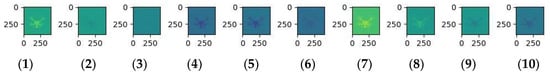 Taking subnetwork 1 as an example, 168 convolution kernels are used for feature extraction, and Figure 5 shows the results of upsampling and feature extraction with the first 10 convolution kernels. The deconvolved image is enlarged to 400 × 400, different convolution kernels extract different features, and some convolution kernels are sensitive to the UAV contour, such as convolution kernels 1 and 7. Some convolution kernels are more sensitive to UAV internal features such as 4 and 5. The 168 convolution kernels jointly extract UAV features from contour, color, detail and other aspects.