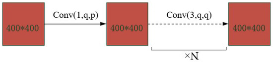 As shown in Figure 3, the network structure is mainly composed of four branches with different resolutions. Feature maps of corresponding resolution images are obtained through feature extraction and nonlinear transformation, respectively. Feature fusion between adjacent resolution feature maps integrates subnetwork image information, and then the target UAV image is obtained through image reconstruction. In this network structure, p is 168, q is 36, and m is 12.