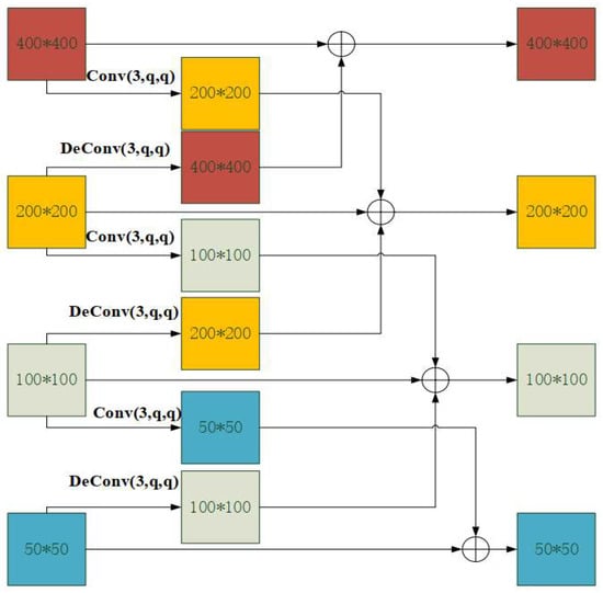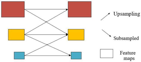 Multi-scale fusion fuses feature maps of different scales to enhance image details, which is conducive to improving the accuracy of super-resolution reconstruction [21]. Images with different resolutions are directly input into different subnetworks, and then feature fusion is performed. The detailed fusion steps are shown in Figure 7. The feature maps are upsampled and downsampled, respectively, and fused with the corresponding size feature maps.