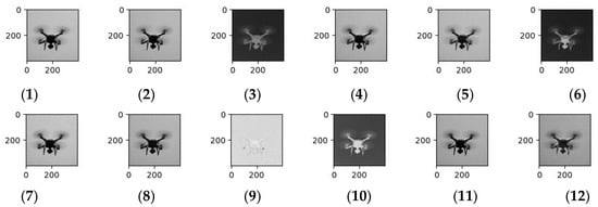 The fusion result shows that the feature map image in subnetwork 1 has a clearer contour, richer details, and contains more detail and contour information. Figure 10 shows the feature map of feature fusion result. The smaller the original input of the network is, the less the contour and detail features are in the output, and the more abundant the low-frequency information is. The fused image can be effectively compatible with high frequency information and low frequency information. Figure 11 is a grayscale image of the feature extraction of 12 convolutional kernels. Some kernels extract information such as contour information, e.g., convolution kernel 9, and some kernels extract low-frequency information inside the UAV (excluding texture features), such as convolution kernel 1, 2, etc. The 12 convolution kernels are extracted together to form the feature extraction part.