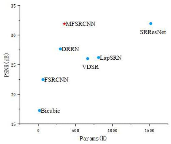 The overall framework and architecture of MFSRCNN are very simple, but it is more effective than many previous models, especially for the problem of UAV super-resolution reconstruction of small targets. MFSRCNN achieves a good balance between model size and reconstruction performance. Although MFSRCNN has more parameters than FSRCNN, DRRN and other lightweight network models, its effect on the UAV test set is substantially different to other network models. Although SRResNet has a good reconstruction effect, its network is too complex, and its network parameters are 3–4 times that of the MFSRCNN model, which requires more network training and UAV super-resolution reconstruction time. According to Table 1, the performance and parameter comparison results of MFSRCNN and other algorithms are obtained, as shown in Figure 14.