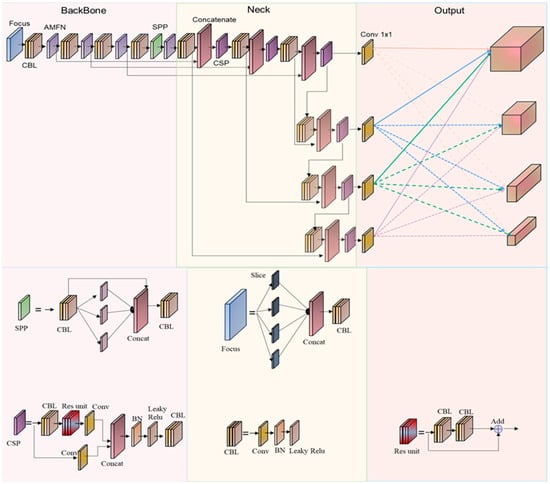 The architecture of AMFN-YOLOv5 (among them, the parts we optimized are the design of the new backbone network part AMFN and the adaptive pyramid fusion strategy in the output. AMFN is in Section 3.2.1, and the adaptive pyramid fusion strategy is in Section 3.2.2. SPP is spatial pyramid pooling, CSP is used for feature extraction, CBL is a component module of resnet, and Focus is an image slice operation).