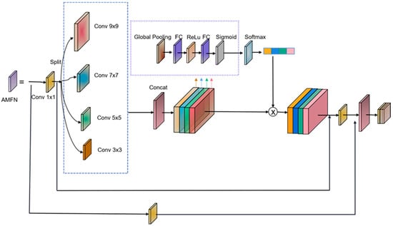 The architecture of AMFN (The calculation process of the AMFN backbone network. The computation process of the AMFN backbone network involves extracting feature importance through attention mechanisms, followed by weight calibration of feature maps that have undergone different convolutions and concatenation fusion using the softmax function).