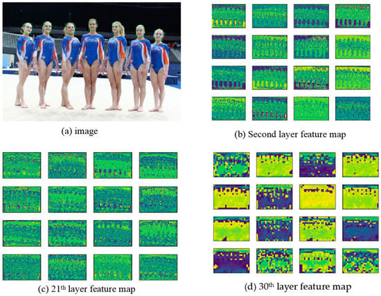 Shallow features and deep features ((a) is the input image with labels, (b) is the feature map of the second layer of feature extraction, (c) is the feature map of the 21st layer in the feature extractor, and (d) is the feature map of the 30th layer of feature extraction).