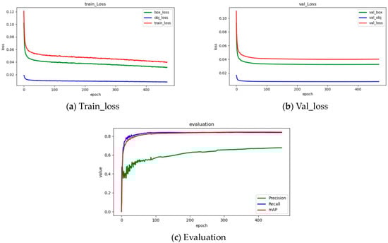 During AMFN-YOLOv5 training, to make the model perform at its optimum, we set the epochs to 500, the weight decay coefficient to 0.001, the learning rate momentum to 0.94, and the learning rate to 0.01 to prevent overfitting. The batch_size is set to 16. To avoid the disappearance of features caused by reducing the image size and the training difficulty, the image’s size is set to 800 × 800. Figure 6 shows the change process of each loss and the change curve of Precision, recall, and mAP in training and verification. The loss tends to be flat at about 400 epochs, and the map is optimal.