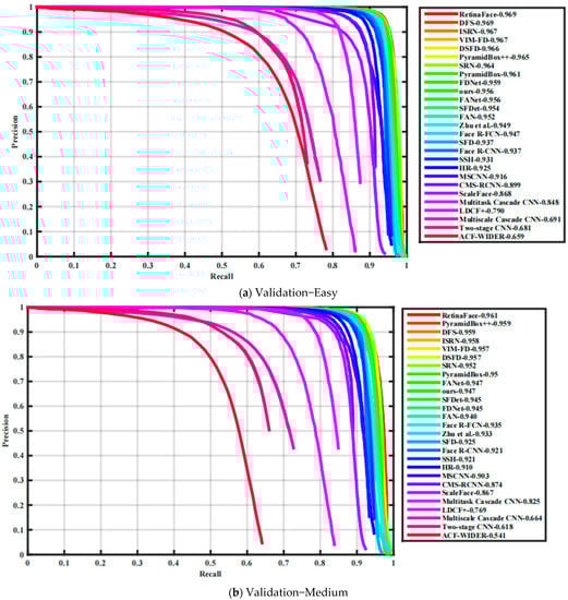 The human face is a special object, and to better solve the problems in face detection, convolutional neural networks (CNNs) have grown in popularity in recent years. Further, scholars applied object detection algorithms [,,,] to detect faces and made progress. Meanwhile, the birth of FDDB [], VOC FACE, and WIDER-FACE [] benchmark datasets, which provide face location information in real-world scenes with high variability in terms of scale, pose, and occlusion, makes face detection ever more widely applied in real complex scenes.