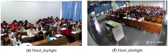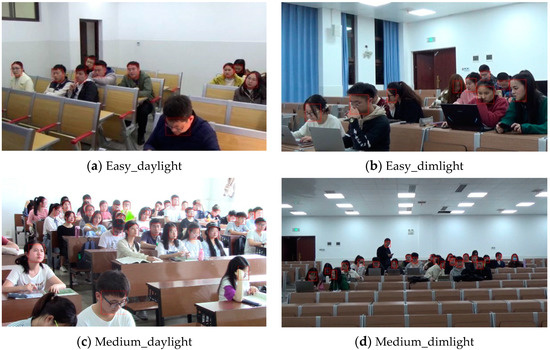 To the best of our knowledge, Classroom-Face is the most realistic and unconstrained face dataset in the classroom environment. We divide the datasets for training and testing in an 8:2 ratio. The test set contains 1582 images in the classroom environment and is divided into three subsets: Easy\Medium\Hard, each of which contains natural light and dim light (daylight/dimlight). Among them, the easy subset contains 1–20 students; the Medium subset is a crowded classroom environment containing 20–30 students; and the Hard subset has several students, ranging from 30–50, with more crowded seats and poor pixels. The specific values are shown in Table 1. We name each part of the dataset based on the above characteristics as shown in Figure 5: Easy-daylight, Easy-dimlight, Medium-daylight. Medium-dimlight, Hard-daylight, Hard-dimlight.