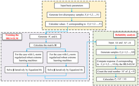 In this paper, the IRLS-ELM in combination with the MCS is used to analyze structural reliability. The algorithm is shown in Figure 2. The following steps provide details about the algorithm.