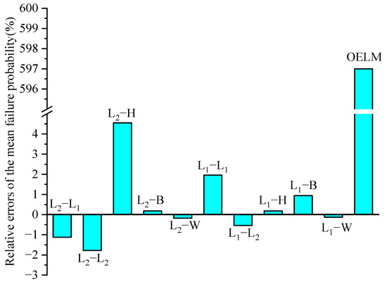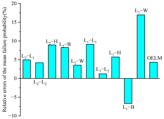 From the Table 5 and Figure 4, it can be observed that among the ten combination methods, the combination L1-L2 has the minimum relative error. The relative errors of failure probability calculated by the combination L2-L1, L2-L2, L2-W and OELM are less than 5% with satisfactory accuracy. The relative errors obtained by the combination L2-H, L2-B, L1-L1, L1-H and L1-B are found to be slightly larger but within 10%. The relative error of the OELM is 4.3%. Compared with the OELM, the combination L2-L2, L2-W, and L1-L2 have higher accuracy. The combination L1-W stands out in delivering relative error beyond 15%.