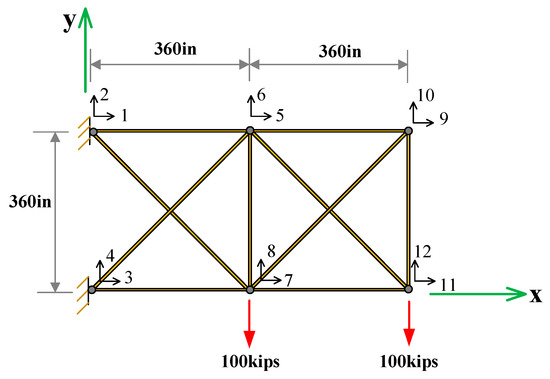 As shown in Figure 6, a ten-bar truss structure is considered. The area of each bar is denoted by which follows the same normal distribution , namely. The allowable value of structural stress is . Generally, the structure as invalid is defined when the stress value of any bar is greater than the allowable value, which .