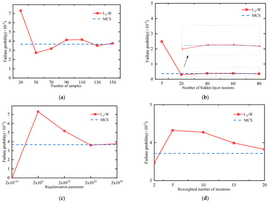The variation trend of failure probability with parameters, including (a) number of samples; (b) number of hidden layer neurons; (c) regularization parameter; (d) reweighted number of iterations.