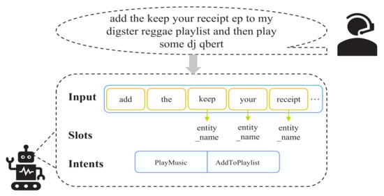 Intent detection (ID) and slot filling (SF) are two important parts of SLU [1,2], which are designed to recognize intents and capture semantic features for task-oriented dialogue systems such as Bixby, Siri, and Jovi. ID is a classification task, the purpose of which is to identify the intention of a user’s dialogue. SF is the process of converting user’s intentions into clear instructions to complement the information, which can be regarded as a sequence labeling task. We abandoned the BIO labeling form and directly used the slot type while annotating each slot at the first and last index positions of the text (e.g., B-entity_name → entity_name and I-entity_name → entity_name). As shown in Figure 1, the sentence “add the keep your receipt ep to my digster reggae playlist and then play some dj qbert” related to playing music and adding playlists is given, which contains multiple slots (entity_name, playlist_owner, playlist, artist) and two intents: PlayMusic and AddToPlaylist.