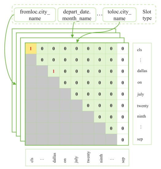 where n and t represent the total number of slot categories and the length represented by the BERT output, respectively. As shown in Figure 3, where is the set of positions for all yellow and green regions under this sample, contains P, which is the set of slot tail pointers and types pointers, where i and j represent the start and tail indexes of a span, and note that all i must be less than or equal to j in Equation (11).