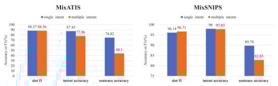 In addition, we wanted to know the effect of single-intent and multi-intent samples on the proposed model. The test set was divided into single-intent and multi-intent based on the number of intentions in the utterances, and the experimental results are shown in Figure 4. The samples of the MixATIS test set were 143 and 685 for single-intent and multi-intent, respectively, with 450 and 1749 for the MixSNIPS test set, respectively. As can be seen from the results: (1) The single-intent and multi-intent samples are essentially equal in slot F1, which indicates that the proposed model addresses the slot incoherence problem well with global pointers; (2) In terms of intent accuracy, MixATIS has a higher gap relative to MixSNIPS in both samples, which may be caused by the unbalanced distribution of intent labels in MixATIS, with only 17 intents in the training set and 18 intents in the test set. Generally, the proposed model can nicely treat both single-intent and multi-intent samples; (3) For sentence accuracy, single-intent samples work better than multi-intent samples. Nevertheless, it is a predictable scenario because the single-intent task is relatively easier than the multi-intent task. In summary, the proposed method obtains a good performance in both samples.