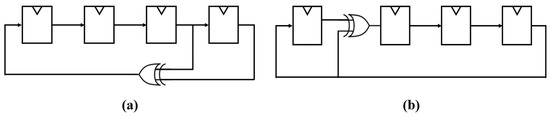 The circuit shown in Figure 3a is a 4-bit Fibonacci LFSR, and the circuit shown in Figure 3b is the 4-bit Galois LFSR circuit. The Fibonacci LFSR is converted to the Galois circuit one-on-one through reversing output. The LFSR includes a feedback loop consisting of a shift register and an XOR gate. The LFSR cannot have an initial seed value of zero because the output is always zero, even if a bit shift occurs. Starting with the seed value containing 1, the bit is shifted in every clock cycle, and the next output is determined by the output of the XOR gate.