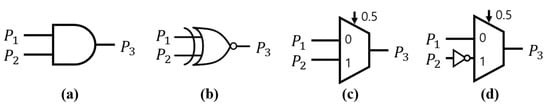 Similarly, the probability of two independent events, A and B, occurring is the sum of their respective probability values. If the probability of the selection signal for the MUX being 1 is P(S), and the probabilities of events A and B being 1 are P(A) and P(B), respectively, the output of the MUX is P(A) × P(S) if the selection signal is 1, and P(B) × (1 − P(S)) if the selection signal is 0. Therefore, the final output of MUX is as follows:
