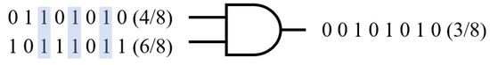 SC replaces arithmetic operators with simple logic gates. For example, a multiplier is replaced by an AND gate, and an adder is replaced by MUX. This is because the probability that two independent events occur at the same time is mathematically the multiplication of the probabilities. If two independent stochastic sequences, i.e., probability values, are the inputs of an AND gate, then the output of an AND gate is equal to the product of the probabilities. For example, if two sequences represent independent probability values 4/8 and 6/8 each, the result of the multiplication, 3/8, is obtained as the output, as shown in Figure 6. Therefore, if SC is applied to repeated operations, the multipliers are replaced with AND gates effectively.