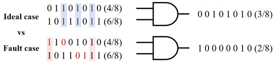 The stochastic sequence is generated using a random number generator and a comparator. Therefore, as shown in Figure 8, when some bits are flipped, the final output is not significantly affected compared to the situation where a bit error occurs in a binary number. For example, in the case of Figure 8, even if a bit flip occurs in the stochastic sequence, the ideal output is 3/8. In a faulty case, the output is 2/8, resulting in a difference of 1/8 compared to the ideal output.