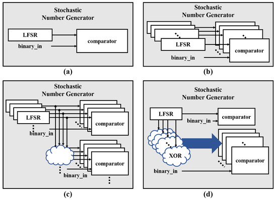 - Tawada, M.; Togawa, N. Designing Stochastic Number Generators Sharing a Random Number Source based on the Randomization Function. In Proceedings of the 2020 18th IEEE International New Circuits and Systems Conference (NEWCAS), Montreal, QC, Canada, 16–19 June 2020; pp. 271–274. [Google Scholar] [CrossRef]