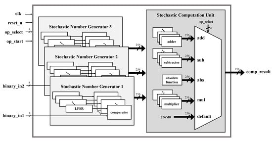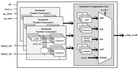 For example, in an 8-bit operation, 256 LFSRs are required, and 256 random initial seed values are also required for the LFSRs. As shown in Figure 11, the stochastic computing unit includes three stochastic number generators to compute addition and subtraction in one clock cycle.