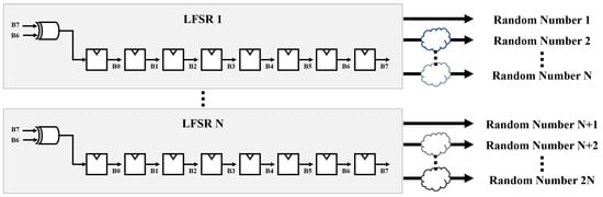 As illustrated in Figure 10, employing multiple LFSRs reduces the time for obtaining multiple random numbers. However, when applying multiple LFSRs, the initial seed values of the LFSRs affect the error rate due to the correlation between random numbers. However, since the output random numbers are directly connected to the registers, multiple LFSRs offer the advantage of being able to operate at a high clock frequency.
