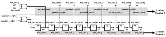 Figure 15 shows the circuit for implementing a 4-stage parallel LFSR. The eight bits lfsr_out[0], lfsr_out[1], lfsr_out[2], lfsr_out[3], lfsr_out[4], lfsr_out[5],lfsr_out[6], and lfsr_out[7] are one 8-bit random number, and bits parallel1[0], parallel1[1], parallel1[2], parallel1[3], parallel1[4], parallel1[5], parallel1[7] are the next eight bits to be output. In the same way, a random number generation circuit was implemented by employing parallel LFSR, as shown in Figure 16.