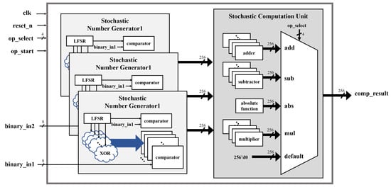 Stochastic number generators are responsible for converting binary numbers into stochastic sequences, consisting of an LFSR, random number generator, and comparator, as shown in Figure 2. The two inputs of the comparator are connected to the outputs of the LFSR and binary input, respectively. The comparator compares the size of the random number from the LFSR and the binary input for each clock cycle and outputs ‘0’ or ‘1’, and the output bits become a stochastic sequence.