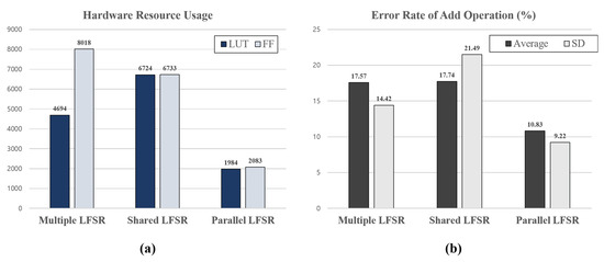 The hardware resource usage of multiple-LFSR-based, shared-LFSR-based, and parallel-LFSR-based stochastic computing architectures implemented on an FPGA, are compared as shown in Table 1 and Figure 18a. The architecture based on multiple LFSRs uses the greatest number of flip-flops. Although a shared-LFSR-based architecture is set to utilize 1/32 flip-flops over a multiple-LFSR-based architecture, it is difficult to obtain a large reduction in hardware resource usage while maintaining the error rate. In addition, the LUT usage in the stochastic number generators increases while applying additional combinational logic compared to the multiple-LFSR-based architecture. Finally, an architecture based on parallel LFSR reduces 58% of LUTs and 74% of flip-flops compared to the hardware usage of a multiple-LFSR-based architecture. Compared to the architecture employing shared LFSRs, the hardware resource usage is reduced to 70% of LUTs and 69% of flip-flops.