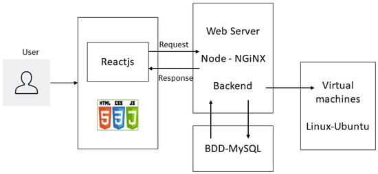 For the development and implementation of the platform, several technologies recommended by developers for web platforms were selected as well as technologies found in the review of similar works [28,29]. Figure 1 shows the architecture designed for the application.
