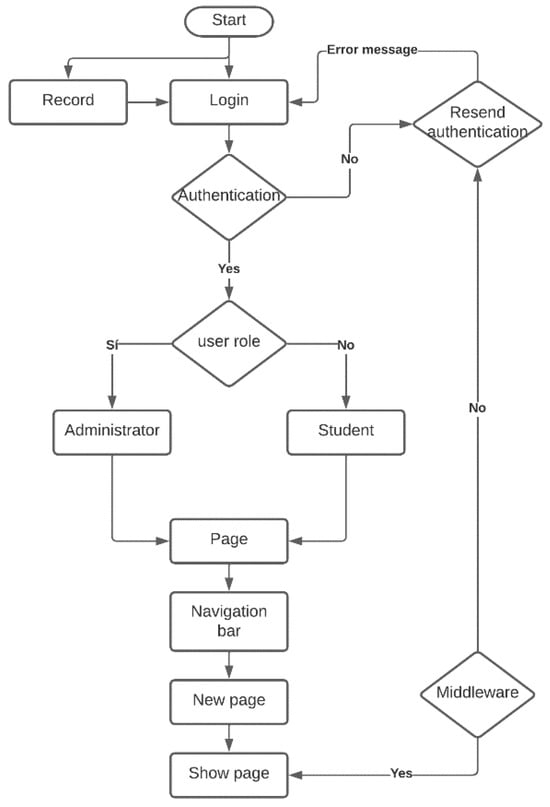 Figure 2 shows the flowchart of the module design and how it interacts with the user. In the first stage, the user contacts the home web page where relevant information about the platform is presented. In the second stage, the registration page is presented to create new users; on the access page, authentication data are requested, for which it is necessary to enter a username and password [32]. The system verifies authentication parameters using middleware that verifies the role of the user, which can be an administrator or student. According to the role of the user, the necessary modules are enabled for each user. Every time a user accesses a new page, the system will verify the user’s role again to guarantee the authorization of the platform, this process is represented in Figure 2.