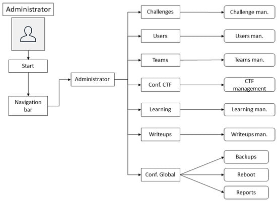 Two types of users and roles have been created on the platform including the administrator and the student. Based on this, a menu and dashboard adapted to the needs of each type of user are shown. The administrator role is presented in the block diagram of Figure 3. This role has at its disposal a dashboard that allows it to manage the platform using various modules such as the configuration of challenges, users, teams, competition, learning, writeups, and global settings [33]. Another important action of this role is the ability to configure, support, and report on student learning. In addition, the administrator has access to all the sections and functionalities of the student to manage, monitor, and control the use and access to the platform [34].