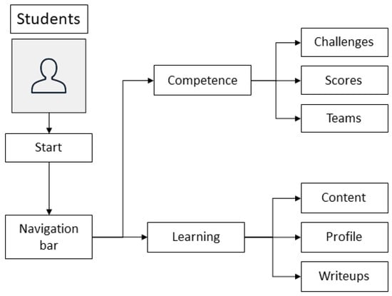 The student role has access to two modules of the platform. The competition module has access to the challenges, scores, and team section [35]. The learning module integrates the learning resources, the user profile, and the writeups, as presented in Figure 4.