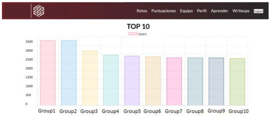 Another section of the platform is that of scores. This section presents the scores of the users during a competition according to the progress in the resolution of the challenges. The results are presented using graphs that indicate the top 10 equipment and their scores [13,37]. Users can visualize in detail the challenges they have resolved when clicking on each of the bars presented in the Dashboard, an example is evidenced in Figure 6.