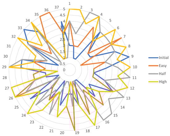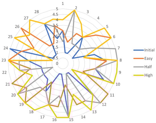 As a complement to the previous table, Figure 7 is presented, in which one can graphically observe the progress or stagnation in the progress of each participant. According to the figure, the results obtained using the initial questionnaire are the lowest in the entire process. However, in most cases, substantial progress is observed at each of the levels. In the final questionnaire that the participants complete at the end of the CTF, it can be seen that they present a substantial knowledge of the cybersecurity topics exposed during the contest, where the progress is shown with the yellow line within the figure.