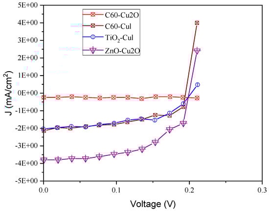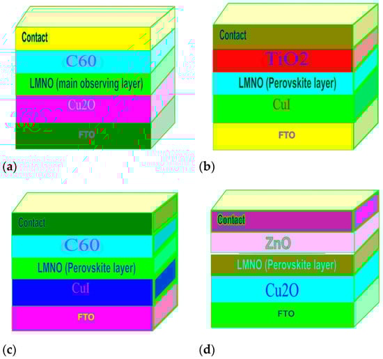 Schematic of various structures. (a) Structure1—C60/LMNO/Cu2O, (b) Structure2—TiO2/LMNO/CuI, (c) Structure3—C60/LMNO/CuI, (d) Structure4—ZnO/LMNO/Cu2O.