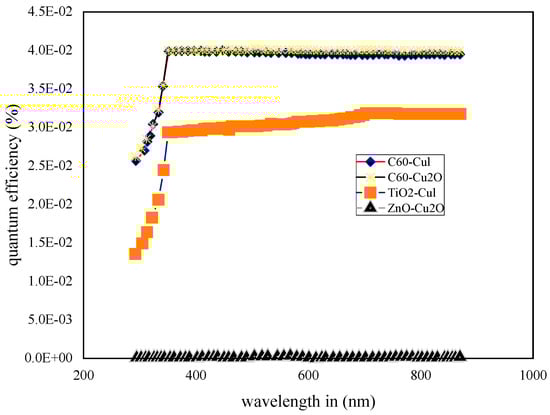 This section presents the investigated characteristics of LMNO double perovskite. The bandgap is a fundamental characteristic of photovoltaic solar cell technologies. We determined that a bankgap of 1.5 eV is optimal for perovskite solar cells; thus, we adopted this value in our research. LMNO models Electron Transport Layers (ETLs) and Hole Transport Layers (HTLs) to determine the efficiency of power conversion between the two. C60/LMNO/Cu2O solar cells offer the best power conversion efficiency. This solar cell has an energy conversion efficiency of 0.43%. Cu2O as a HTL has not been extensively studied in the past. ZnO/LMNO/Cu2O demonstrates the lowest performance. Figure 4 shows the current densities for the different proposed structures, and it is observed that the maximum current density was observed for the C60/LMNO/Cu2O structure. Figure 5 shows the quantum efficiency of all the simulated structures, which is the function of the wavelength. It demonstrates how the quantum efficiency is varying s a function of incident wavelength in all the proposed structures. The performance parameters of simulated devices are shown in Table 2. At all interfaces and surfaces of each layer of the simulated device, the optical reflectance is set to zero.