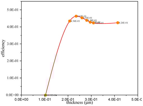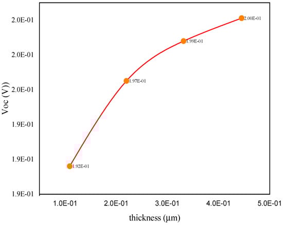 Table 3 indicates how perovskite thickness affects the efficiency and open-circuit voltage. It is essential to have a sufficiently thick absorber layer for efficient light absorption. Photon-generated electrons and holes must be able to reach the outer contact with little recombination, necessitating optimal thickness. This implies that up to a particular thickness, the power conversion efficiency increases but thereafter decreases. The greatest results are achieved using the geometry C60/LMNO/Cu2O (efficiency 0.43). Figure 6 shows the efficiency as a function of thickness variation by adjusting the thickness of perovskite from 0.1 to 1 mm in batch simulations. It is observed that optimal performance is achieved with a thickness of 0.22 mm. As seen in Figure 7, the open-circuit voltage rises with increasing perovskite thickness.