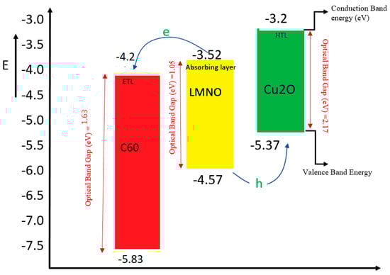 A change in defect density occurred at 10(e) cm3. It was determined that the Jsc saturates at a fault density of 109 cm3 and that below this threshold, the parameters fluctuate relatively minimally. Table 4 illustrates the results collected. As seen in Figure 8 and Figure 9, defect number has a negligible impact on solar cell properties. The energy-level diagram of the corresponding structures using C60/LMNO/Cu2O and TiO2/LMNO/CuI is shown in Figure 10 and Figure 11, respectively.